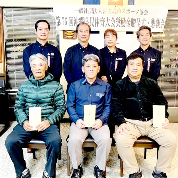 市スポーツ協会(砂川恵助)は6日夕、「第76回沖縄県民体育大会」において宮古地区代表として出場し、3位入賞を果たした卓球男子チーム、バスケットボール男子チーム、ウェートリフティングチームに対し市内飲食店で奨励金の贈呈式を行った。