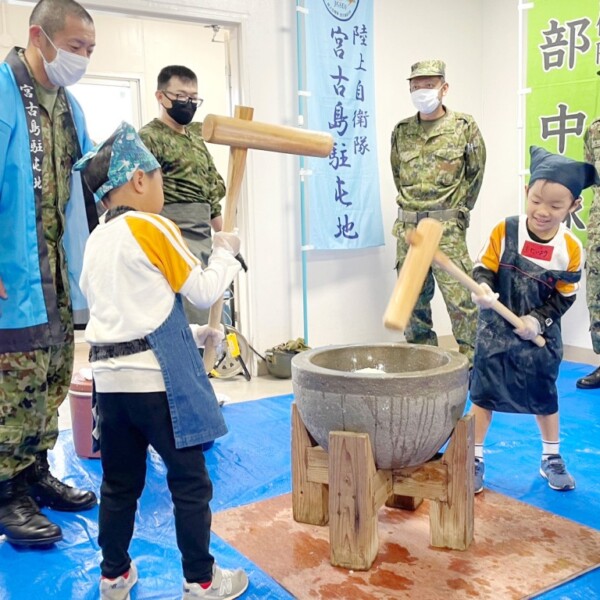 陸上自衛隊宮古島駐屯地(比嘉隼人司令)は19日、同駐屯地で市内のこども園と合同で年末行事のもちつきを行った。