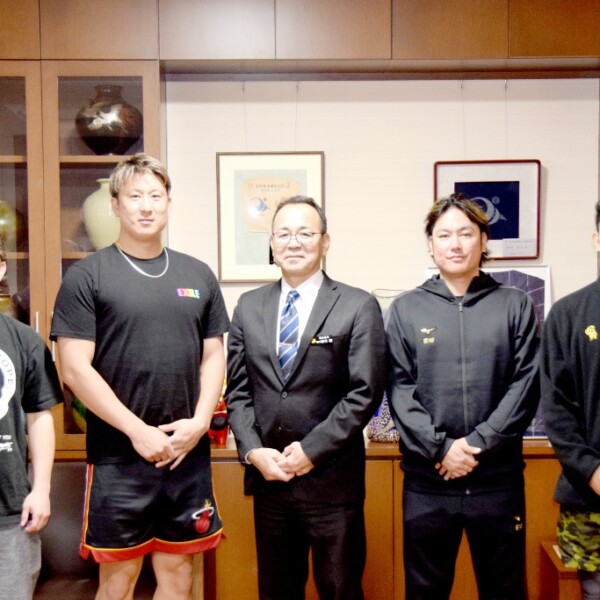 プロ野球・オリックス・バファローズの杉本裕太郎、西野真弘、大城滉二の3選手が7日、市役所を訪れ、砂川朗副市長へ伊良部球場で行っている自主トレーニングの状況や島での手応えを報告した。