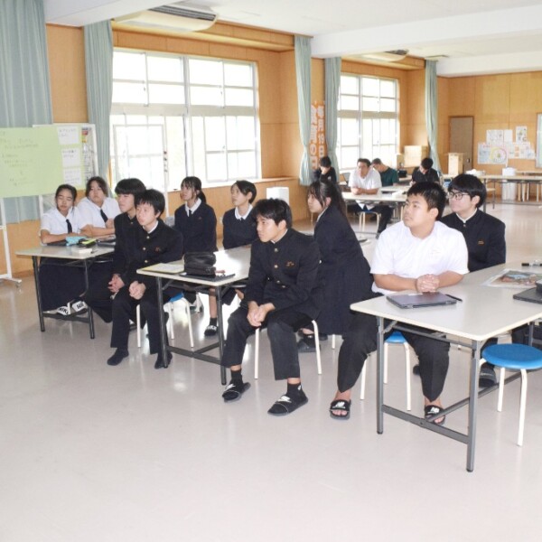 国際協力人材育成事業・国際協力理解促進事業として知られるJOCA沖縄の金城明子さんと矢田部建佑さんは5日、狩俣中学校で全校生徒を対象に出前講座を実施した。