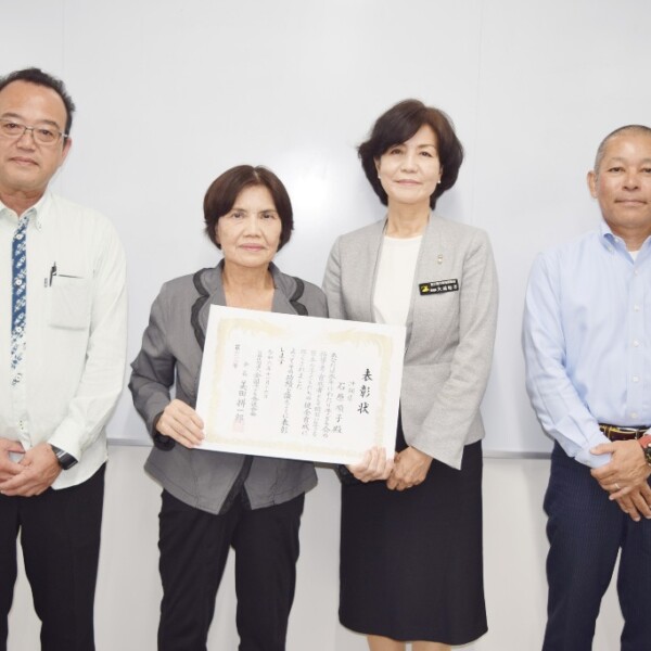 宮古島市子ども会育成連絡協議会副会長の石原順子さんが27日、大城裕子教育長に「全国子ども会育成連合会長賞」の受賞を報告した。