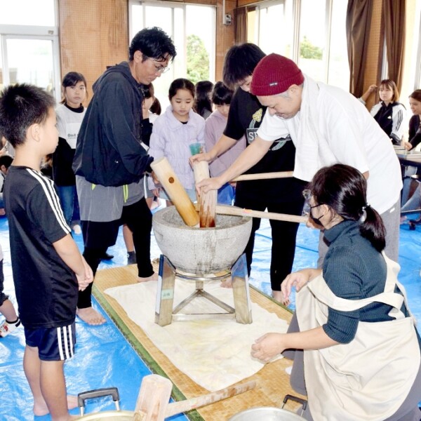 下地児童館母親クラブは1日、同児童館で新年行事の一環として、子ども約60人と大人約20人が参加する餅つき大会とゆし豆腐づくりを開催した。
