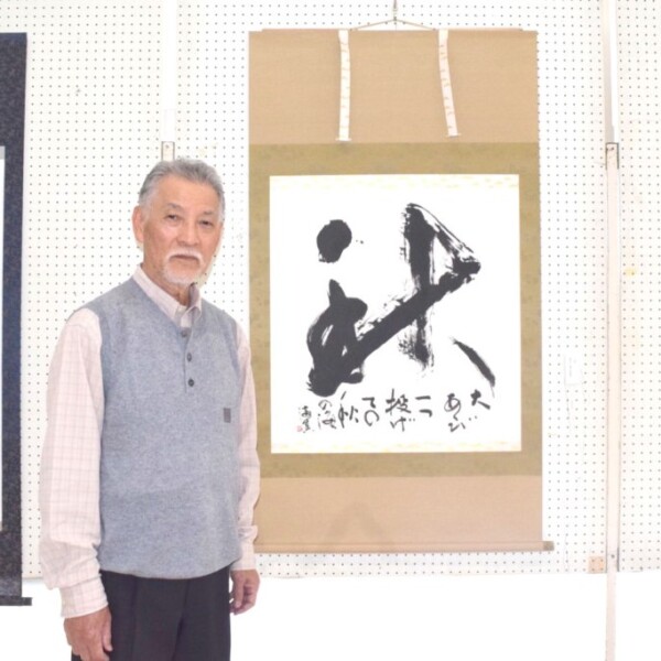 蒼海書道会主宰の池田海真さんは現在、市役所1階エントランスホールで書展を開催している。