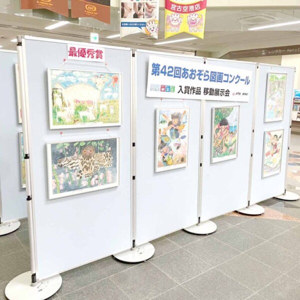 第42回JTA・RACあおぞら図画コンクール宮古地区移動作品展が26日、宮古空港で開幕した。