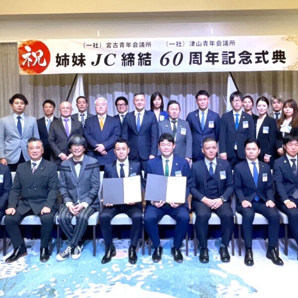 岡山県津山市と宮古島市に所在するそれぞれの青年会議所(JC)は14日、市内久貝のホテルで姉妹JC締結60周年記念式典を開いた。