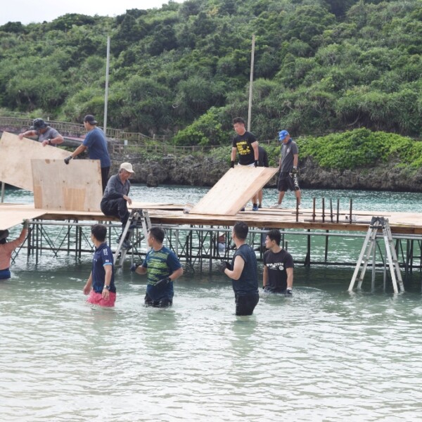 13日に城辺友利のインギャーマリンガーデン特設会場で開催される「第17回なりやまあやぐまつり」(同まつり実行委員会主催)に向けた舞台設営が始まっている。