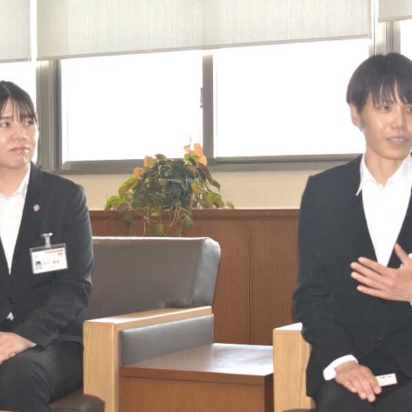 国際協力機構(JICA)の海外協力隊員として新たに市から派遣されることになった亀濱千比呂さんと宮平明奈さんが26日、JICA沖縄の倉科和子所長と共に市役所で嘉数登副市長を表敬訪問し、派遣先での抱負や意気込みを語った。