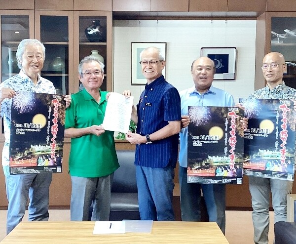 なりやまあやぐ実行委員会(友利聖乗会長)のメンバー4人は16日、市役所を訪れ、10月13日開催予定の第17回大会に座喜味一幸市長の出席とあいさつの協力を求めた。