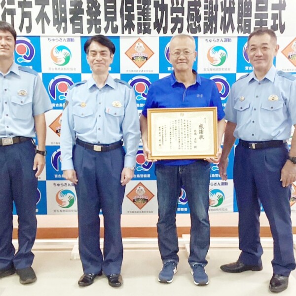 宮古島警察署(新垣健一郎署長)は12日、同署で行方不明者の発見と保護に貢献した功労者で西城在住の花城正信さんに感謝状の贈呈式を行った。