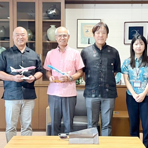 日本航空(JAL)の清水新一郎副会長らは21日、市役所を表敬訪問し、嘉数登副市長と会談した。
