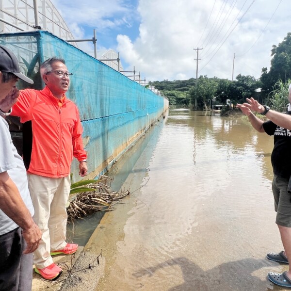 宮古島市区選出の下地康教県議が24日、大雨により冠水被害を受けたマンゴー農園を視察し、被害状況を確認した。