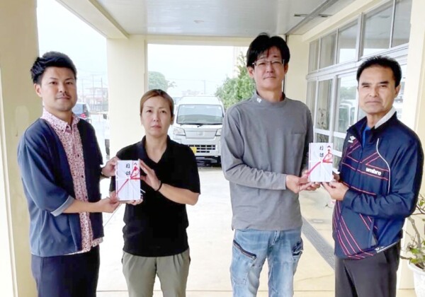 来年1月に東京体育館で開かれる第78回全日本バレーボール高校選手権大会(春高バレー)に、沖縄県代表として出場する西原高校チームを激励しようと、佐良浜学区体育協(下地秀虎会長)は13日、同地区出身で県代表として出場する選手の全国舞台での活躍を願い、下地会長と佐久本暁事務局長が両選手の保護者に激励金を手渡した。