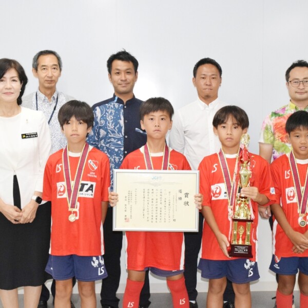インデペンディエンテジャパン宮古島チームの選手らが16日、市役所に大城裕子教育長を訪ね、JCカップ「U―11少年少女サッカー大会沖縄地区予選2024」の優勝、9月に大阪で開催される全国大会に沖縄代表で出場することを報告した。