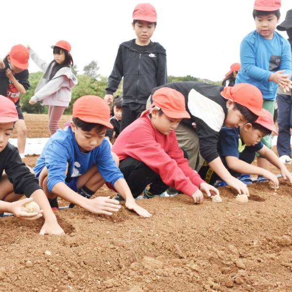 JAおきなわ宮古地区青壮年部上野支部(徳嶺勝哉支部長)は28日、上野支部専用の畑で上野小学校2年生を対象にジャガイモ、ニンジン、タマネギの野菜植え付け体験の食育活動を行った。