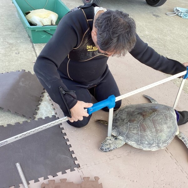 愛知県名古屋市在住のウミガメ研究家、小林清重さんが13日、城辺の新城海岸でアオウミガメ2頭の捕獲調査を実施した。