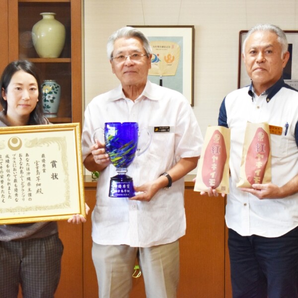 県産加工食品のトップを決める「2024おきなわ島ふ~どグランプリプラス」で最優秀賞を受賞した松川千鶴さん(宮古島芋畑代表)が22日、市役所で座喜味一幸市長を訪ね、受賞報告を行った。