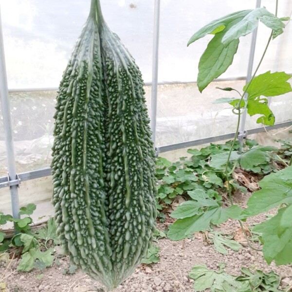 上野宮国のゴーヤー農園(宮国美根男代表)で珍しい双子のゴーヤーが発見された。