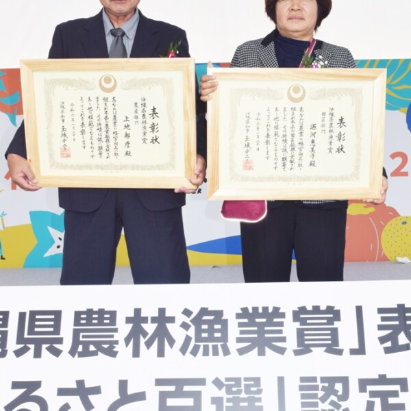 【那覇支局】おきなわ花と食のフェスティバル初日の20日、那覇市奥武山公園の会場内で県農林漁業賞の贈呈式が行われ、宮古からは農産部門(サトウキビ)で上地邦彦さん(73)=下地字上地、園芸部門(野菜)で源河恵美子さん(66)=伊良部=がそれぞれ受賞した。