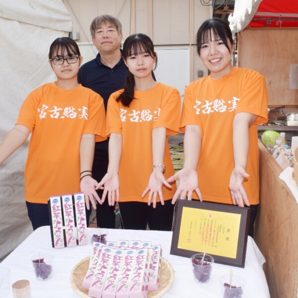 【那覇支局】花と食のフェスティバル2024が開催されている那覇市奥武山公園の会場で、宮古総合実業高の女子生徒3人が、同校が開発した商品の販売促進活動を行っている。