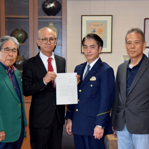 宮古島地区交通安全協会(下地隆之会長)と宮古島地区防犯協会(前川尚誼会長)、宮古島警察署(新垣健一郎署長)は25日、市役所に嘉...