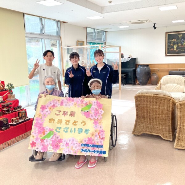下地嘉手苅にある介護老人保健施設シルバーケア悠悠の利用者らが下地中学校3年生に卒業を祝う壁紙を贈った。