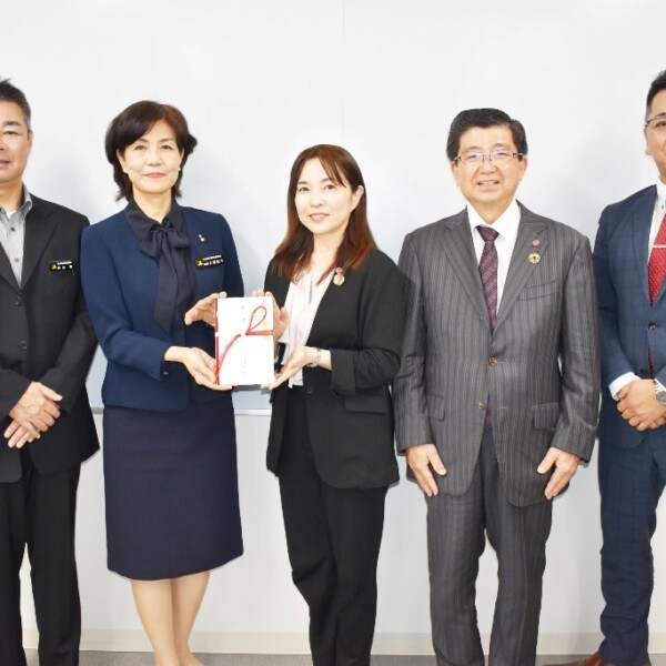 15日に開催する女子プロゴルフトーナメント「全管協・三光ソフラン・レディースカップ」で、主催の全国賃貸管理ビジネス協会長で三光ソフランホールディングス代表の高橋誠一さんら関係者が14日、市役所に座喜味一幸市長を訪ね、環境活動支援で寄付金を贈呈した。