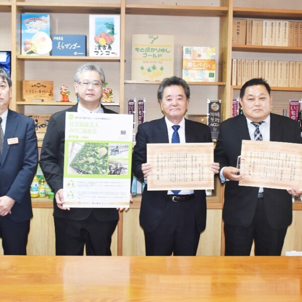 【那覇支局】農林水産省が農山漁村の有するポテンシャルを引き出すことにより地域の活性化や所得向上に取り組んでいる事例を選定する「第10回ディスカバー農山漁村(むら)の宝」に選ばれた宮古島市のみやこ福祉会の伊志嶺博司理事長らは21日、県庁に前門尚美県農林水産部長を訪ね、受賞報告を行った。