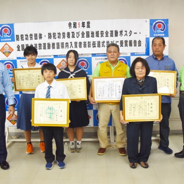 2023年防犯団体・防犯功労者および全国地域安全運動ポスター・全国暴力追放運動標語の県内入賞者の表彰伝達式が28日、宮古島警察署で開かれた。