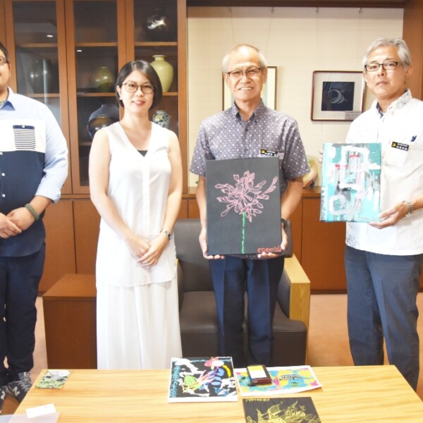 県内で障がい者アーティストの自立を支援するドアレスアートオキナワ代表理事の呉屋マリヤさんが28日、市役所で嘉数登副市長と松堂英彦福祉部長を来訪し、同法人に所属する宮古在住アーティストが2人になったことの報告と、宮古を皮切りに離島でのさらなる活動の拡大を誓った。
