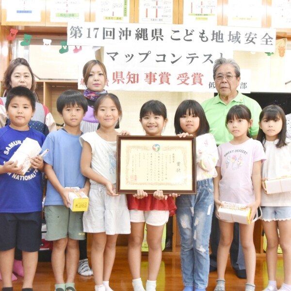 ひばり放課後児童クラブのひばりっ子宮古島まもる隊の9人が作成した「ちいき安心安全マップ」がちゅらうちなー安全なまちづくり推進会議事業の「第17回県こども地域安全マップコンテスト」の低学年の部で県知事賞を受賞した。
