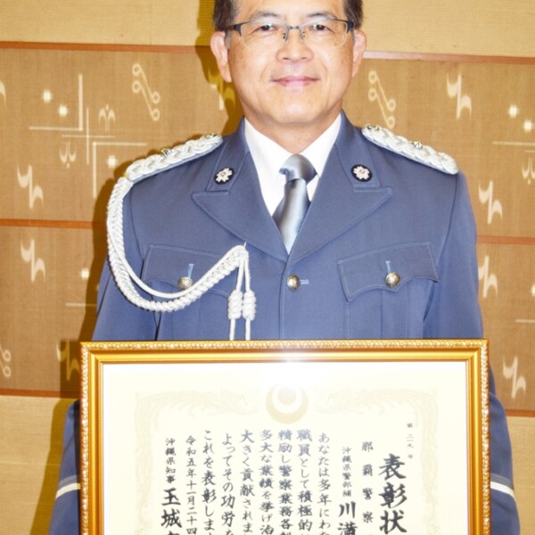 【那覇支局】2023年県警察職員「県知事表彰」表彰式が24日、那覇市の県警本部で催され、警察業務に多大な功績を挙げ治安維持に大きく貢献した5人が表彰を受けた。