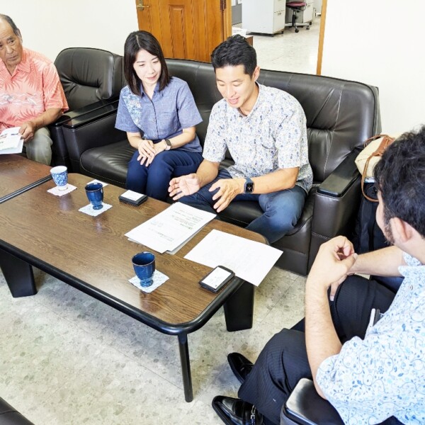 中小企業基盤整備機構理事長の豊永厚史さんは15日、市役所に座喜味一幸市長を訪問し、域内循環・国内販路開拓を目的とした「ぷからす交流商談会・スキルアップセミナー&相談会」周知の要請を行った。