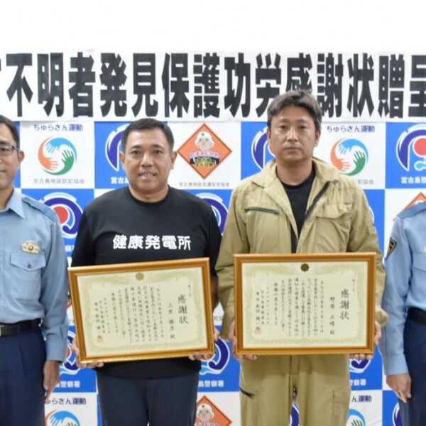 城辺地区で発生した行方不明者事案の保護に貢献したとして宮古島警察署は6日、上里勝彦さん(51)と野原正晴さん(42)に感謝状を贈呈した。
