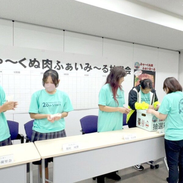 市農林水産部畜産課は6日、市役所で市制施行20周年記念事業の一環となる「みゃ~くぬ肉ふぁいみ~る抽選会」を開催した。
