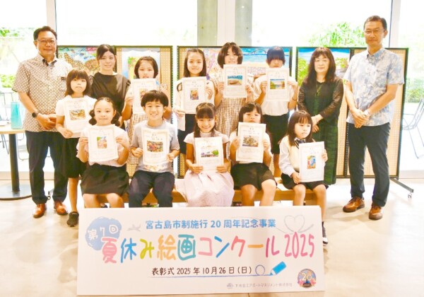 市制施行20周年記念事業の一環として、第7回夏休み絵画コンクール(下地島エアポートマネジメント主催)の表彰式が26日、下地島空港ロビーで行われた。