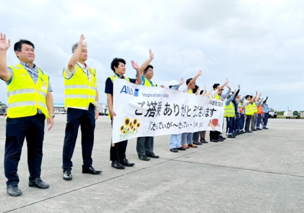 全日本空輸(ANA)は27日、宮古空港で宮古―石垣線の就航1周年を記念し、午前8時45分発の石垣行き(ANA1791便)搭乗客に記念品を贈呈した。