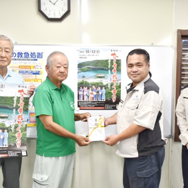 10月12日にインギャーマリンガーデンで開催される第18回「なりやまあやぐまつり」の成功に役立ててほしいと古波蔵組(古波蔵太志代表)は29日、同実行委員会(奥浜健会長)に寄付金を贈呈した。