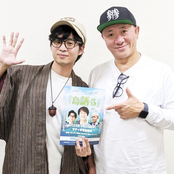 25日にマティダ市民劇場で開かれるトークイベント「島語る」を前に、出演する宮古島出身の芸人で放送作家の若林凌駕さんと俳優・芸人で活躍する三又又三さんが23日、宮古新報社を訪れた。