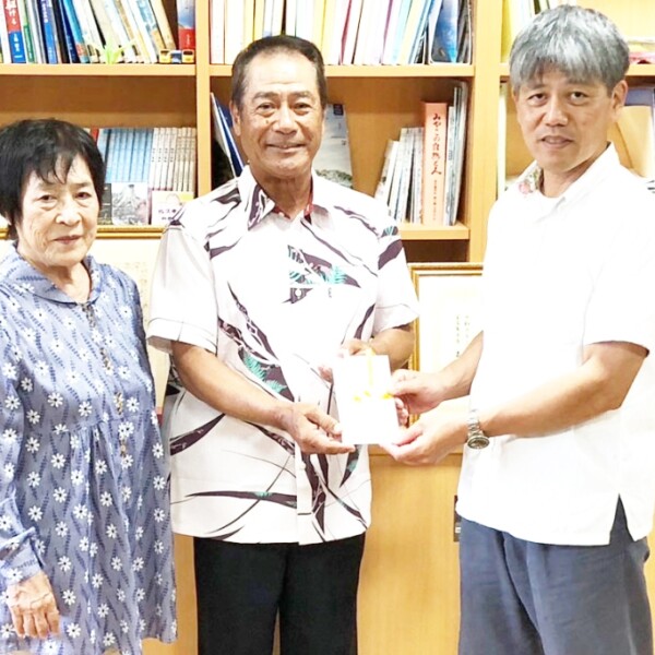 佐良浜小・中学校の昭和30年生卒業生が24日、母校となる伊良部島小中学校に寄付金を贈呈した。