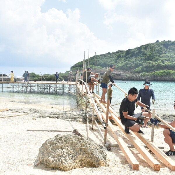 あす8日に城辺友利のインギャーマリンガーデンで開催される第16回なりやまあやぐまつりに向けて同実行委員会(友利聖乗会長)は6日、海上特設ステージの設置に取り組んだ。