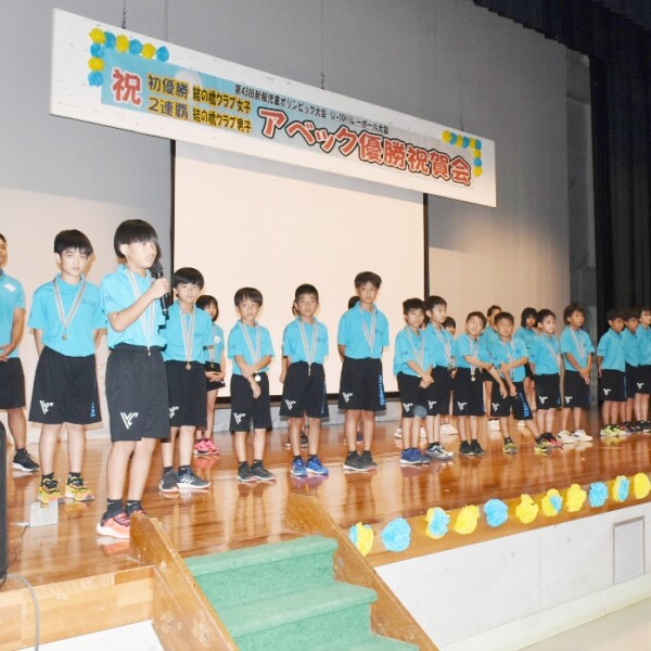 第43回新報児童オリンピックU―10小学生バレーボール大会で2連覇を達成した結の橋クラブ男子と初優勝した同女子の祝賀会(主催・同クラブ男女父母会)が26日、伊良部公民館で行われた。