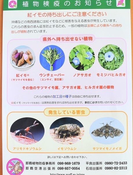 病害虫のまん延を防止するため植物防疫法により、沖縄県、奄美群島、トカラ列島、小笠原諸島からサツマイモやゲッツキ、カンキツ類など一部の植物では移動が規制されている。