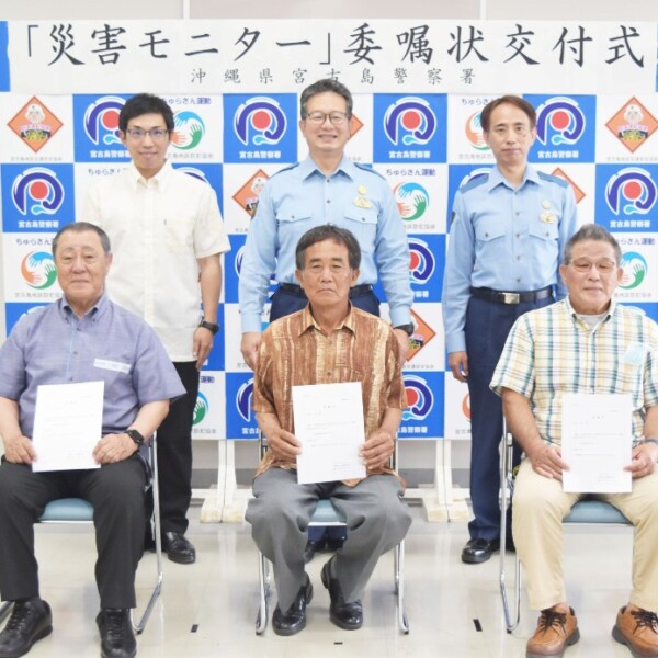 宮古島警察署(喜屋武一郎署長)は11日、災害モニター委嘱状交付式を同署で行った。喜屋武署長から式に参加した3人に委嘱状が手渡された。