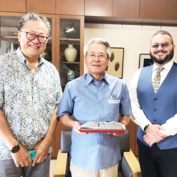 ジャンボツアーズの谷村勝己社長とMSCジャパンのオリビエロ・モレリ社長は24日、市役所に座喜味一幸市長を訪ね、2024年1月から日本発着で史上最大のクルーズ船ツアーが宮古島市に寄港する計画を報告。