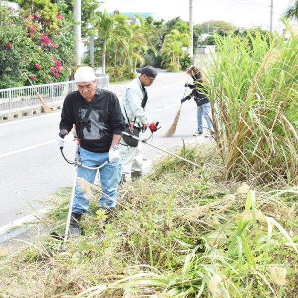 広栄開発(仲村智幸代表)と千代田開発(洌鎌昌美代表)は8日、地元久松学区の通学路の清掃活動を行った。