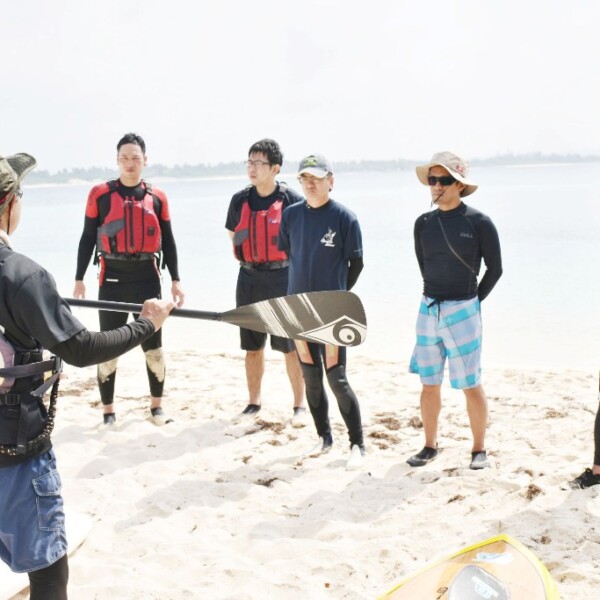 宮古島海上保安部(福本拓也部長)は22日、来間島の来間漁港ビーチで職員に対してスタンドアップパドル(SUP)の操作研修を行った。