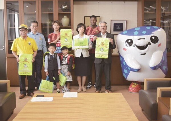 宮古島市役所で6日、交通安全グッズの贈呈式(主催・市交通安全推進協議会)が行われた。