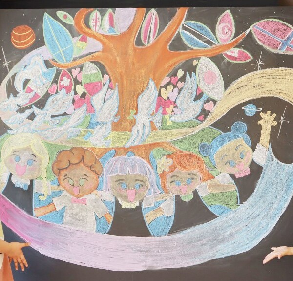 はなぞのこどもえんで平和願い黒板アート 上原美春さんが描く