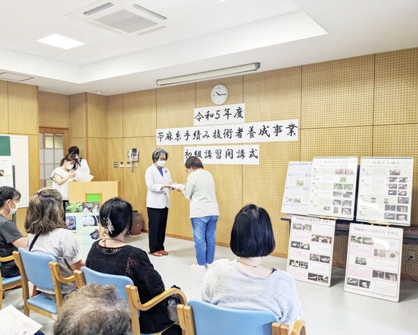 宮古苧麻績み保存会(漢那明美会長)の2023年度苧麻糸手績(ちょまいとてう)み技術者養成事業の初級講習開講式が13日、市伝統工芸品センターで行われた。