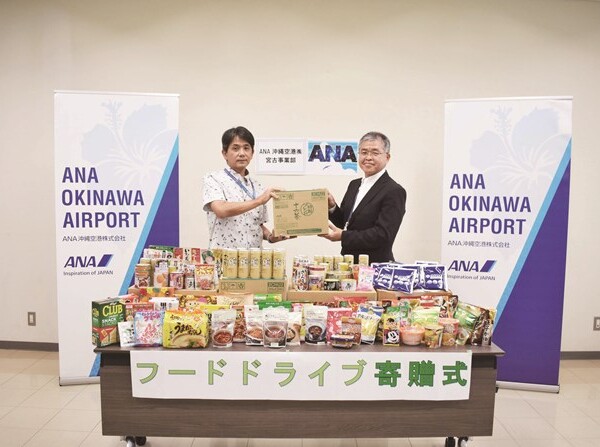 ANA沖縄空港宮古事業部(具志英樹部長)は24日、フードドライブとして職員が家庭から持ち寄った食品を宮古島市社会福祉協議会に贈呈した。